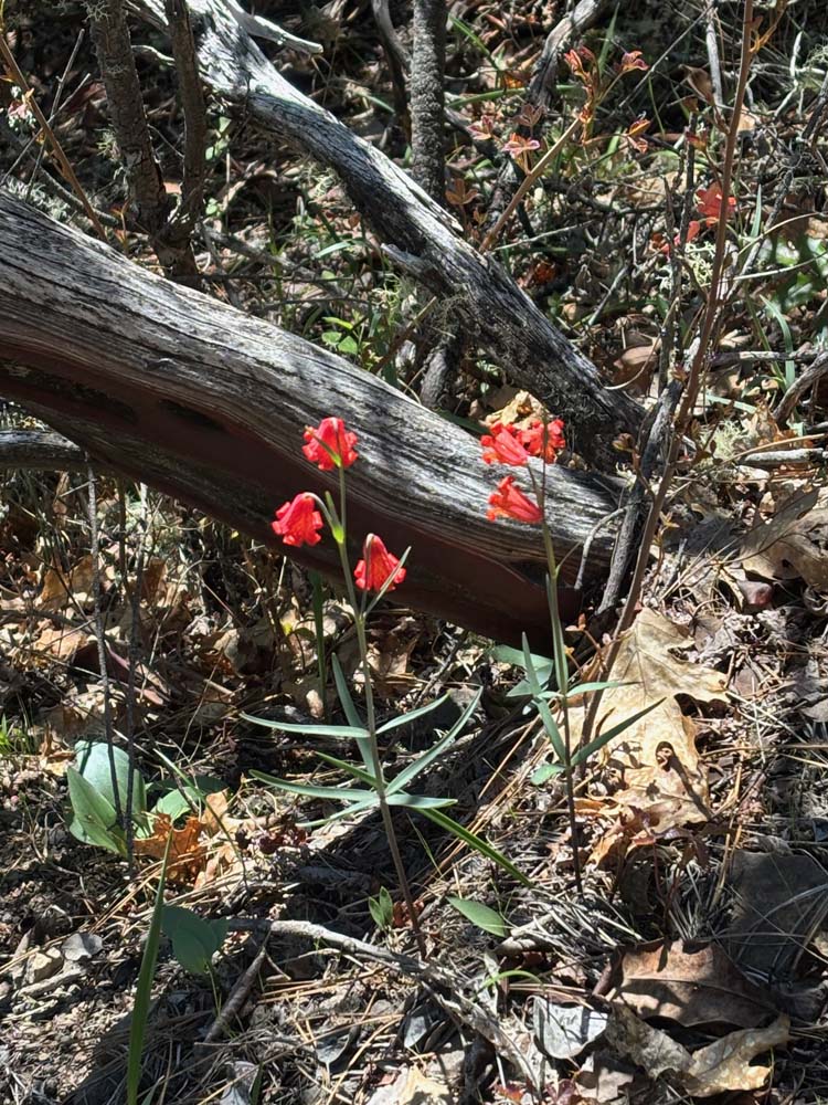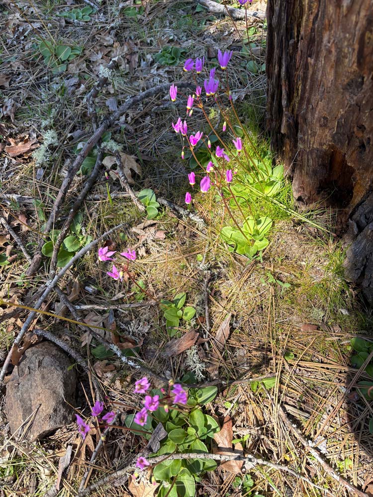 Fourteen of us met up at Ashland CVS and then stopped to rendezvous with those in Medford at Fred Meyer gas station lot. We were happy to welcome Lynn to our group. We headed up to Lewis Road TH where we began our hike in the open forest of Douglas fir, ponderosa pine and black oak. We crossed the old bridge to Fire Glen Camp for a stop and visit. Continuing beyond the beach area, we ventured along a cliff of lava boulders to delight in the great views on a sunny day. When we reached the relatively new, beautiful bridge, Elisabeth stayed put to take care of her Achilles tendonitis. Alison and Sue picked up to lead. When they reached the intersection with the rocky climb to the Blue Grotto, all but three climbed up to the Grotto to see if there was water falling off the cliffs. We’d heard from Monday group hikers who did the same journey that the falls were non-existent. More moisture must have developed in the meantime, because our group was regaled with a showy waterfall. Poison oak was very abundant, including 5-6’ stands, but it was not yet hanging onto the trail. We enjoyed the early spring wildflowers, with shooting stars most abundant. We saw blooming Oregon grape, purple flowering hounds’ tongue, fawn lily, and more, but finding some red bell fritillaria was the most thrilling. The hike was about 5 miles RT with 150’ elevation gain without counting the climb to the Grotto.